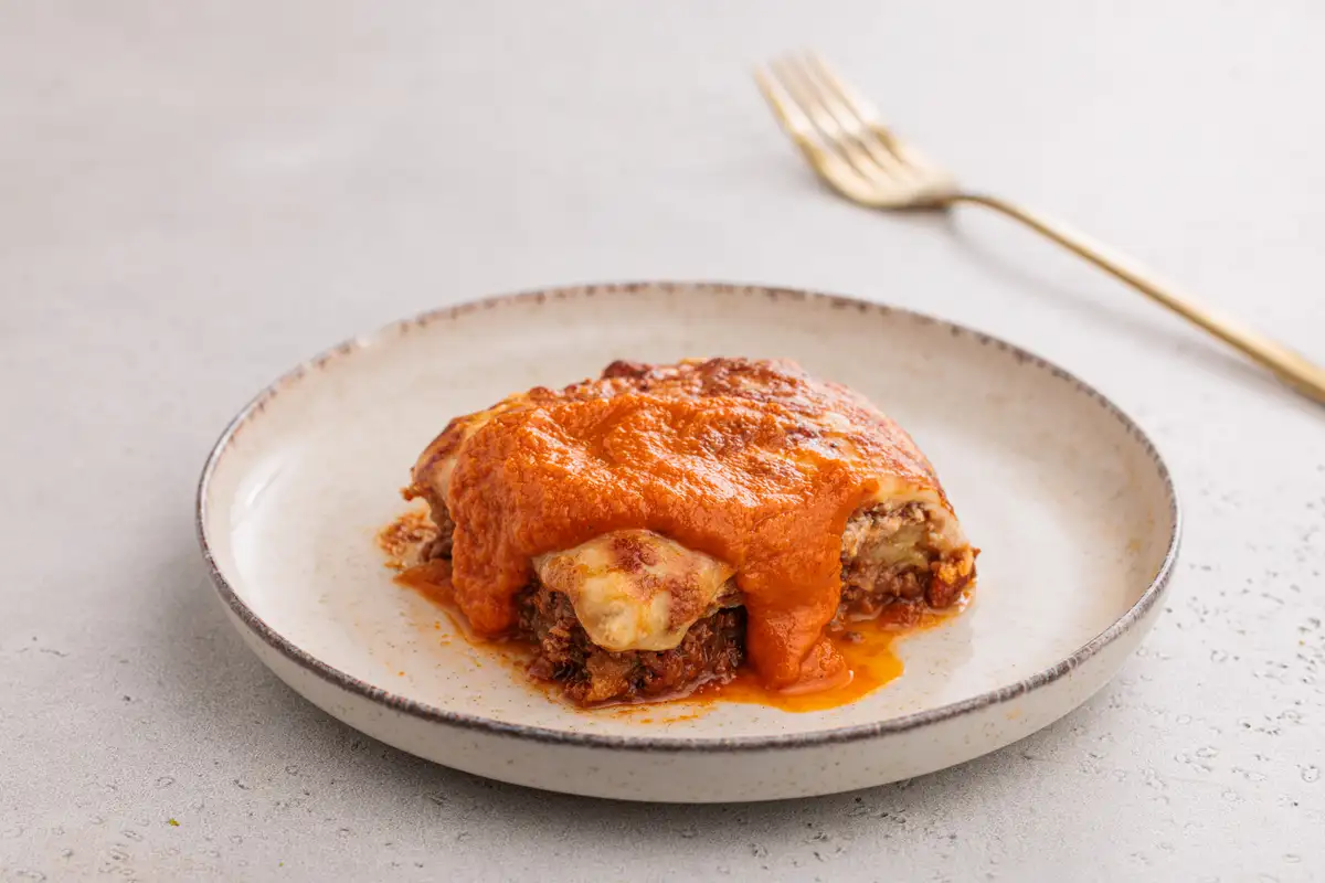 قطع براونيز محضرة من خليط دقيق اللوز المناسب لحمية الكيتو، ومسحوق الكاكاو، وقطع الكاكاو الداكن غير المحلاة، ومغطاة بطبقة من كريمة الكاكاو.
